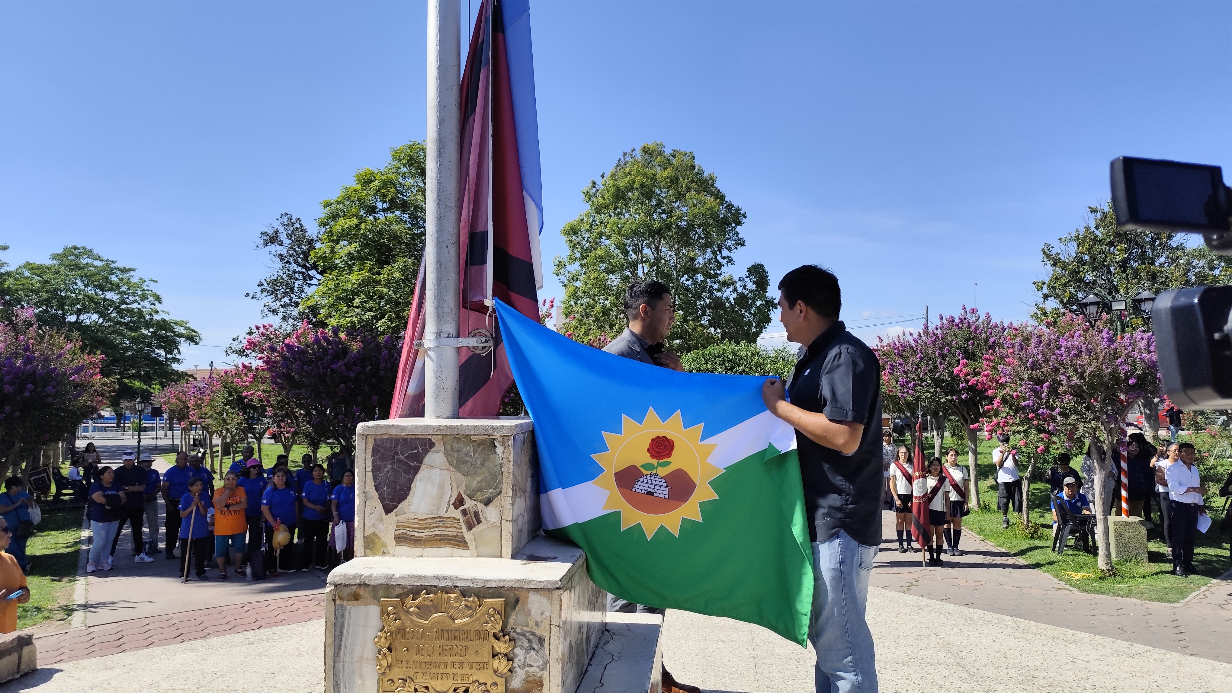 La presentación oficial de la bandera se realizó en la Plaza San Martín de La Merced, en un acto que reunió a autoridades municipales, representantes de instituciones y vecinos de la localidad. En representación del Prof. Nicoleno, asistieron el Secretario General de la UNSa, Cr. Alberto Mariscal, y el Secretario de Bienestar Universitario, Lic. Luis Portelli, quienes acompañaron la ceremonia en nombre de la Universidad.