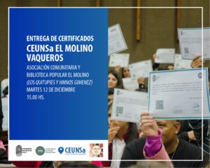 🟢 ACTO DE ENTREGA DE CERTIFICADOS EN EL CEUNSa EL MOLINO VAQUEROS 🔵 El martes 12 de diciembre a hs.Leer mas »