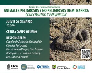 🟢 VERANO 2025. CEUNSa Campo Quijano| Charla de Extensión Universitaria: Animales peligrosos y no peligrosos de mi barrio: conocimiento yLeer mas »
